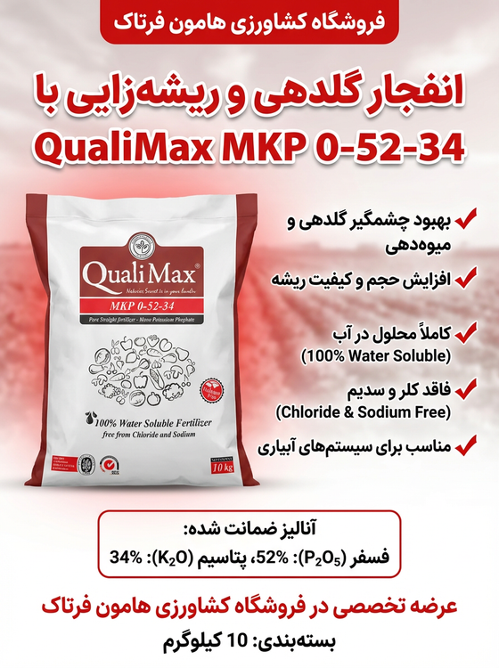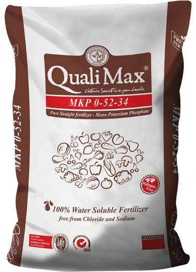 کود مونوپتاسیم فسفات کوالی مکس از ۳۴ درصد پتاسیم و ۵۲ درصد فسفر تشکیل شده است که کاملاً فاقد سدیم، کلر، فلزات سنگین و عناصر مضر است